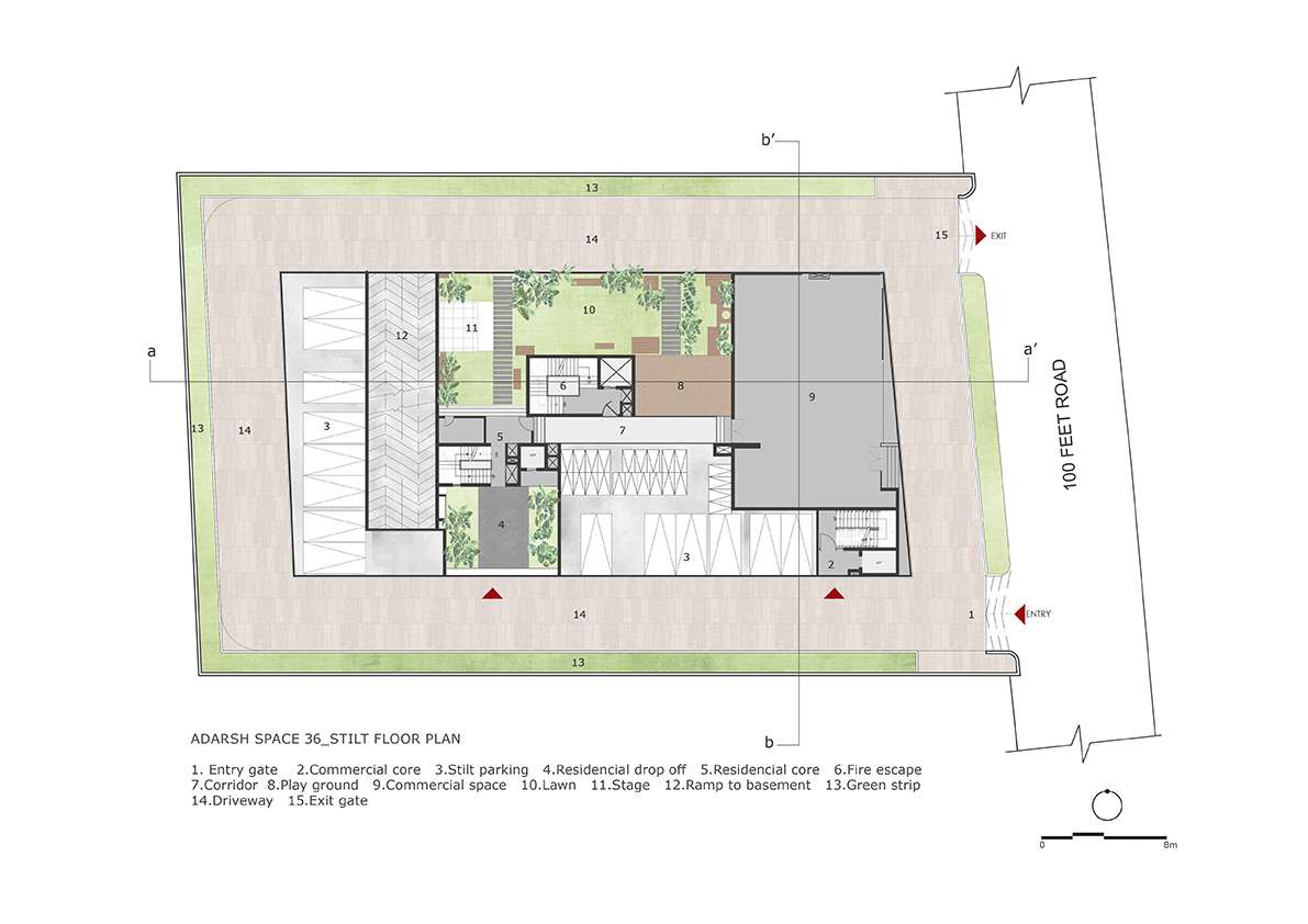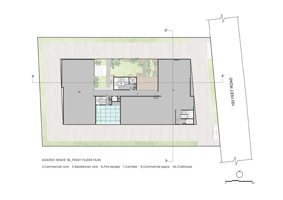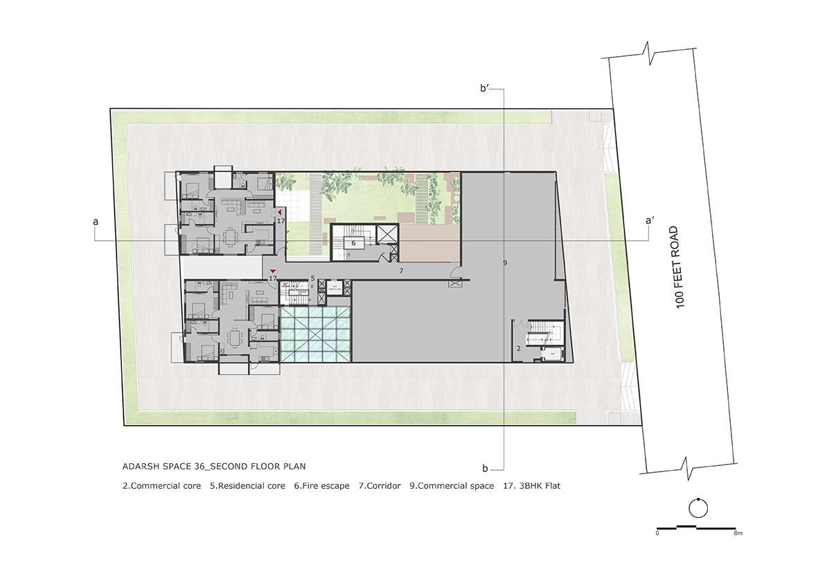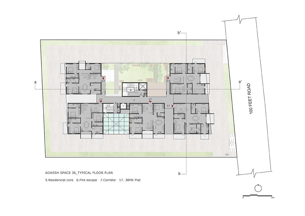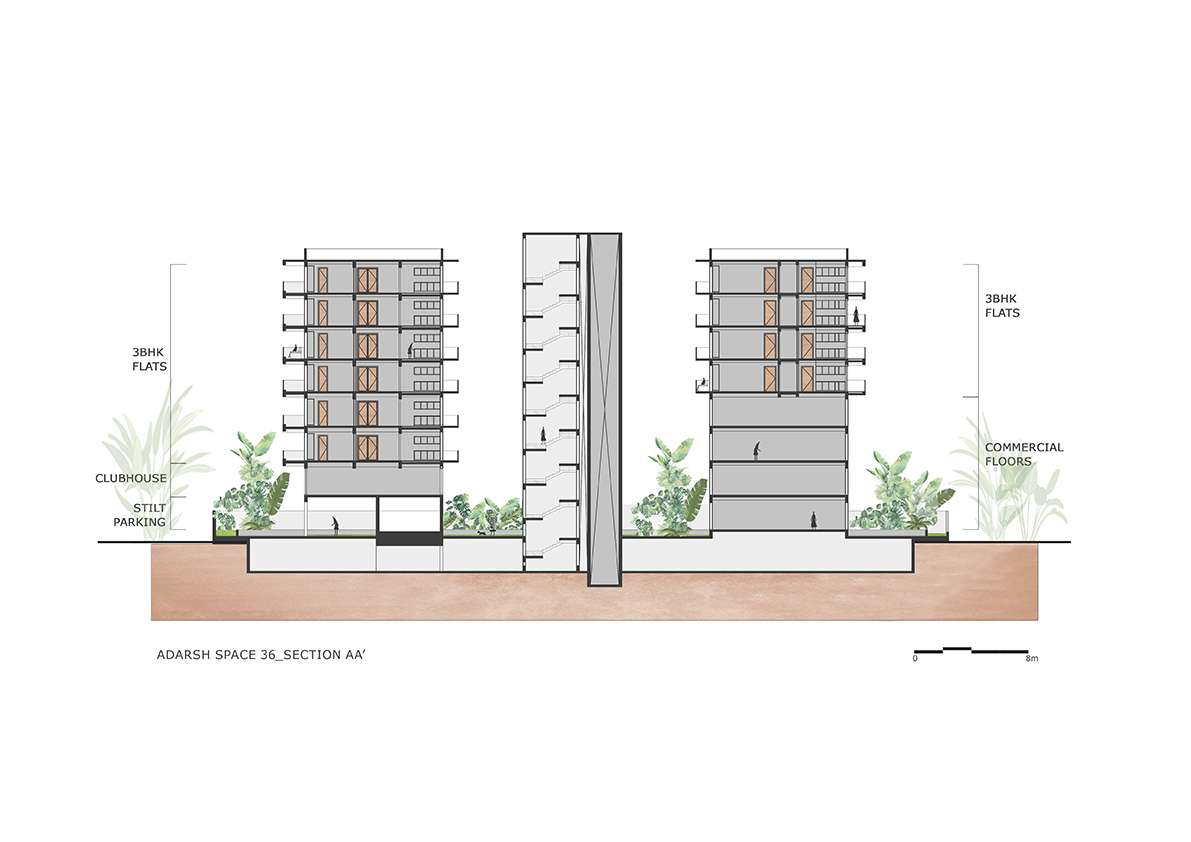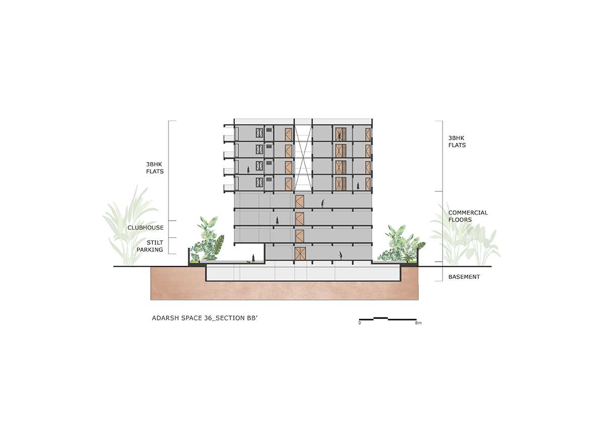 Space 36 is an eight floors residential complex with commercial space included in the front of the compound. This structure includes 24 flats, a clubhouse and 4 floors of commercial space. This project is designed to encourage green spaces, visual axis and connectivity. Unlike every typical residential complex, dedicated spaces are designed for entertainment, rejuvenation and play. The individual flats are designed to allow maximum sunlight and cross ventilation along with beautiful views from every balcony.